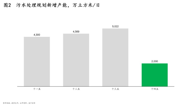 一是污水處理日漸成熟。近年我國(guó)城鎮(zhèn)污水處理任務(wù)已基本完成,城市污水處理率已經(jīng)達(dá)到95%以上,在“十四五”規(guī)劃中的污水處理新增產(chǎn)能也出現(xiàn)明顯下降(見圖2)。在污水處理漸趨飽和的情況下,先前遭到忽視的污泥處理問題重新得到關(guān)注。