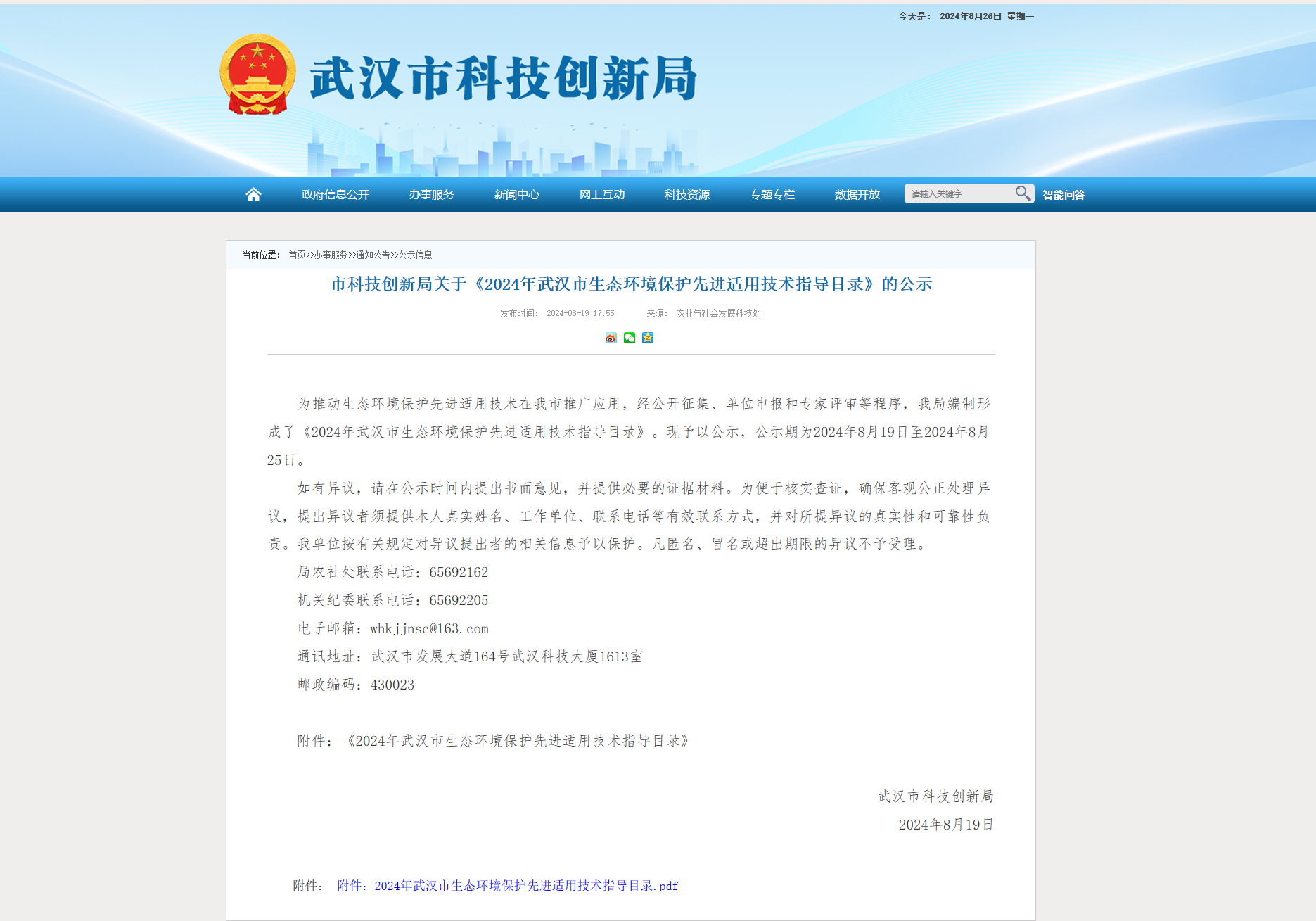 為深入貫徹生態(tài)文明思想,推動生態(tài)環(huán)境保護(hù)先進(jìn)適用技術(shù)在武漢市推廣應(yīng)用,為武漢市生態(tài)環(huán)境保護(hù)提供技術(shù)支撐,市科技局編制了《2024年武漢市生態(tài)環(huán)境保護(hù)先進(jìn)適用技術(shù)指導(dǎo)目錄》,并在全市范圍內(nèi)公開征集生態(tài)環(huán)境保護(hù)先進(jìn)適用技術(shù)。