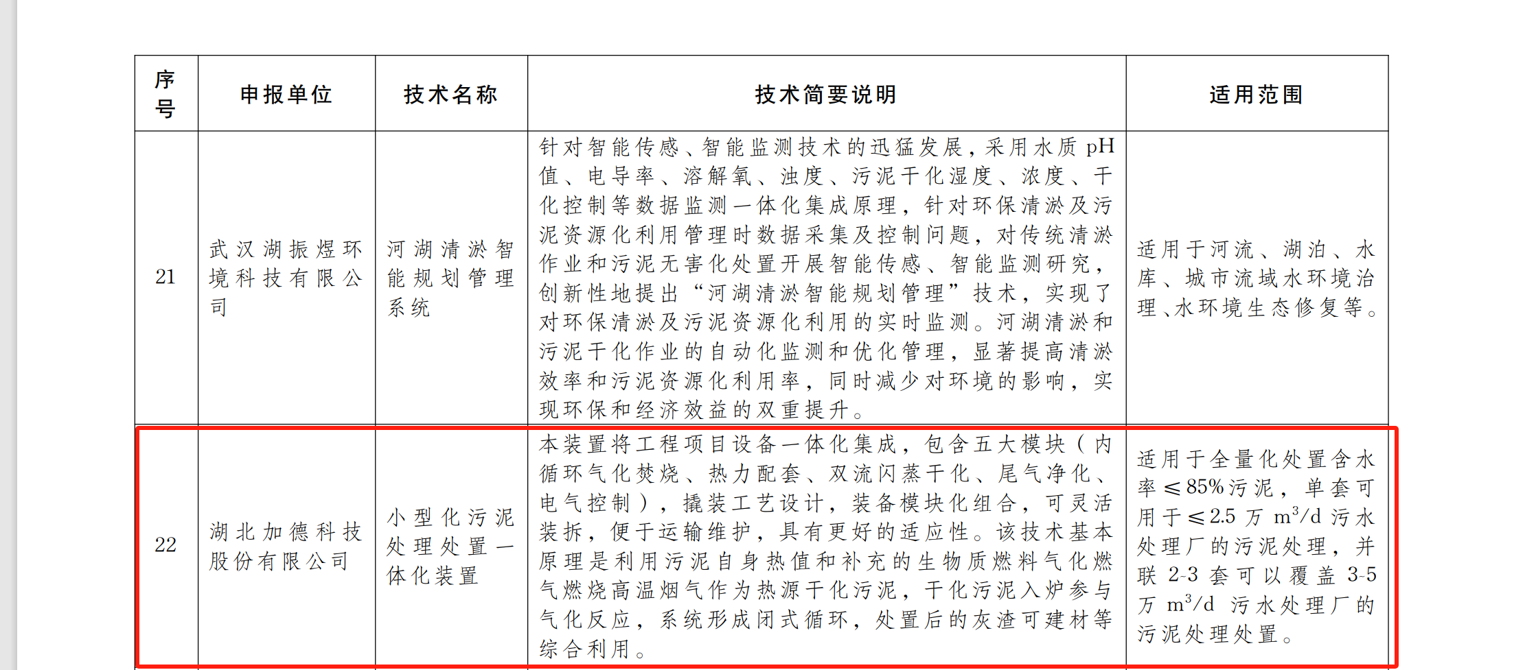 經(jīng)公開征集、單位申報和專家評審等多項程序,該目錄名單于2024年8月19日正式公布。加德科技的“小型化污泥處理處置一體化裝置”技術(shù)入選。