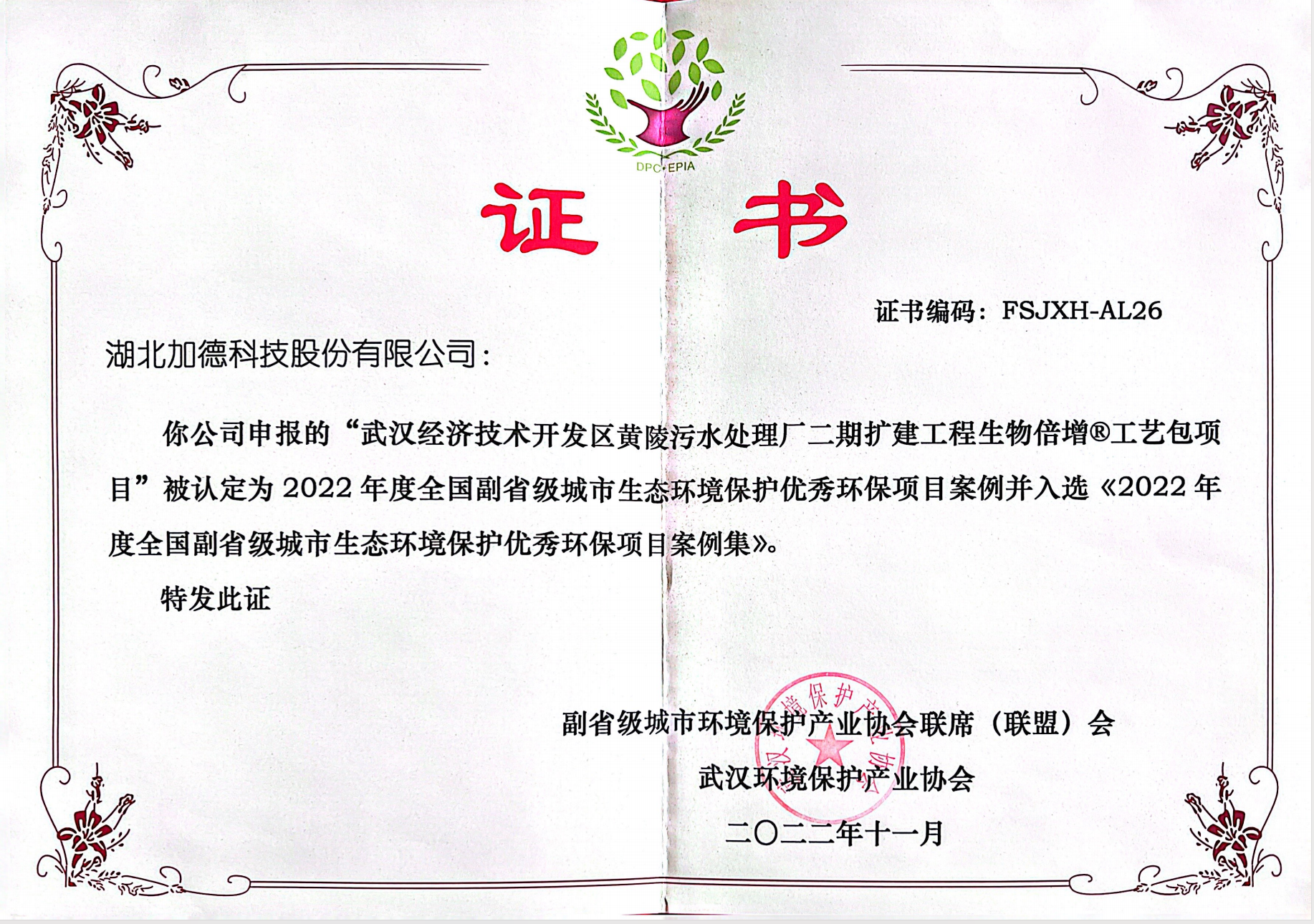 “武漢經(jīng)濟技術開發(fā)區(qū)黃陵污水處廠二期擴建工程生物倍增@工藝包項目”認證證書
